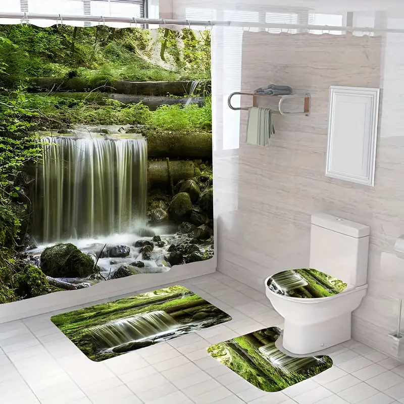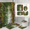 Nature Print Shower Curtain Set Bathroom Rug U shape Mat