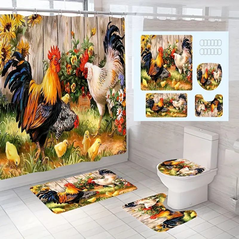 Rooster Aesthetic Art Decoration Shower Curtain Set – Waterproof with 12 Hooks
